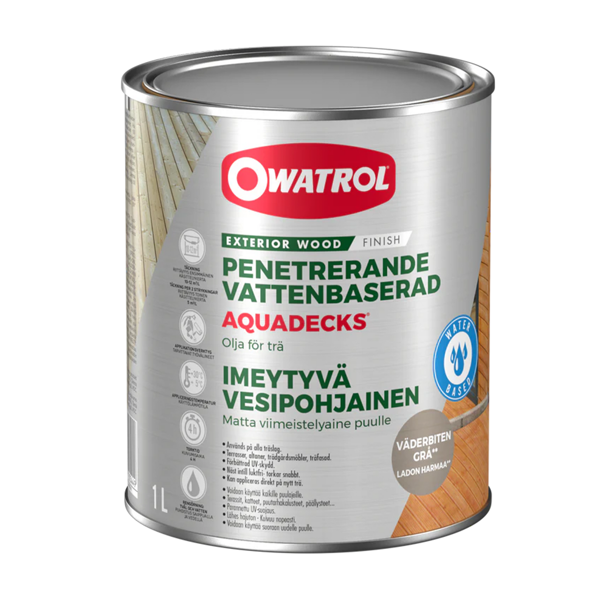 Aquadecks är en penetrerande, vattenbaserad olja som ger en långvarig matt finish till alla typer av trä. Klar att använda, torkar snabbt och doftar endast svagt. Eftersom Aquadecks mättar och stabiliserar träet minimeras uppkomsten av sprickor, skevheter och andra skador som orsakas av UV-strålar och fukt.